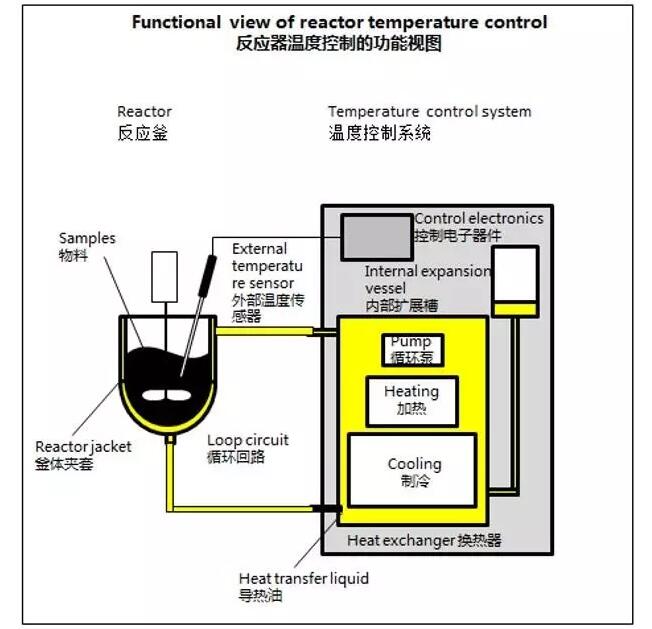 為了控制反應(yīng)釜的溫度,溫度控制系統(tǒng)持續(xù)將導(dǎo)熱油通過循環(huán)泵打進(jìn)反應(yīng)釜的夾套中。反應(yīng)釜內(nèi)部的溫度突變,將通過溫控設(shè)備的快速加熱和制冷來進(jìn)行補(bǔ)償,實(shí)現(xiàn)動(dòng)態(tài)平衡。導(dǎo)熱油在溫控設(shè)備中被加熱和制冷。右圖為簡化的溫控體系示意圖。